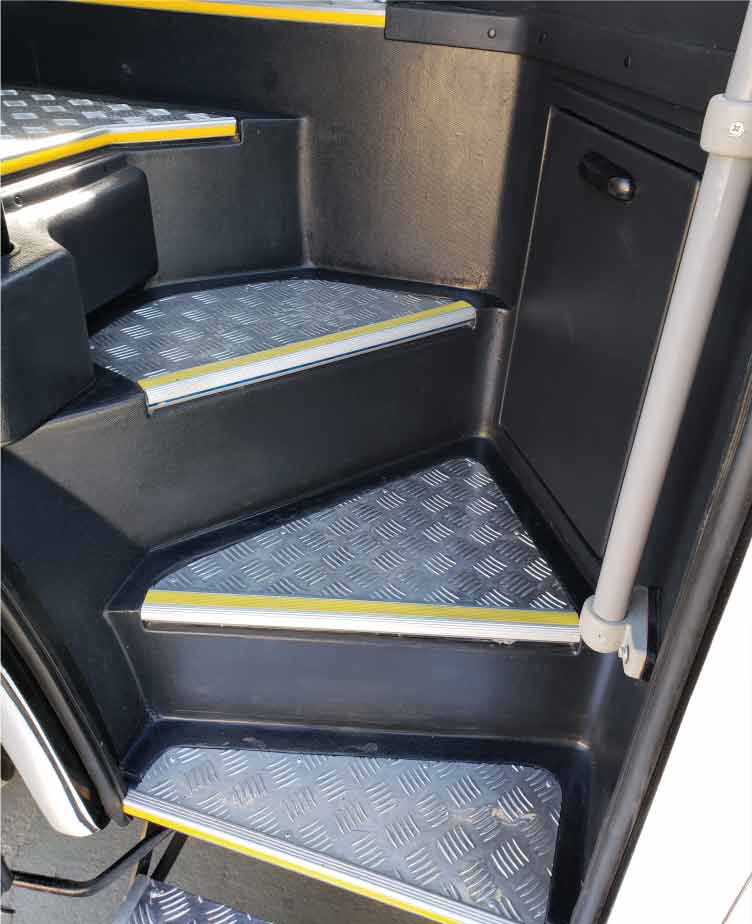 Diseño panorámico con vidrios templados de acuerdo a norma y fibra de vidrio. Puerta amplia de acceso al salón de pasajeros.